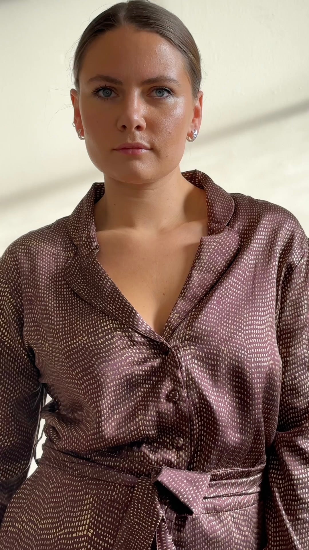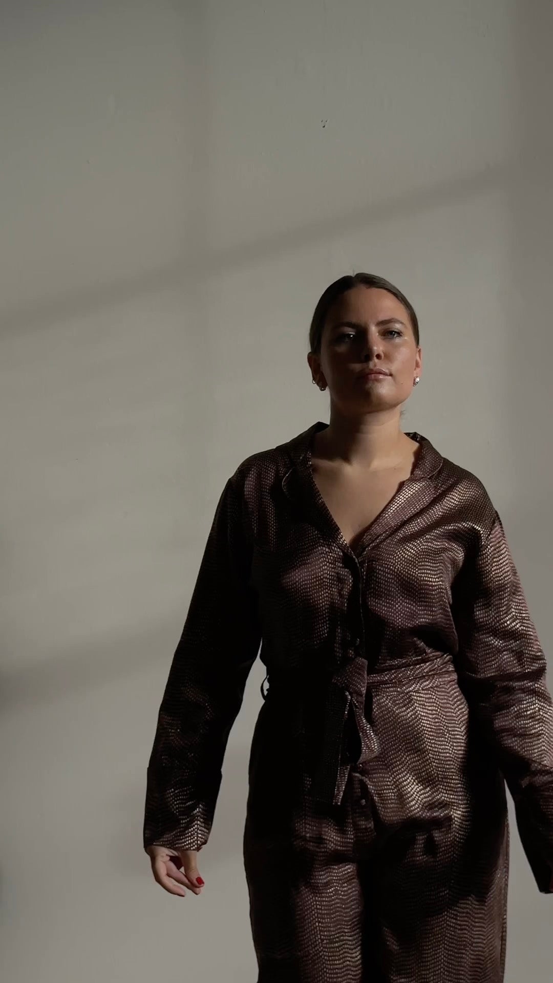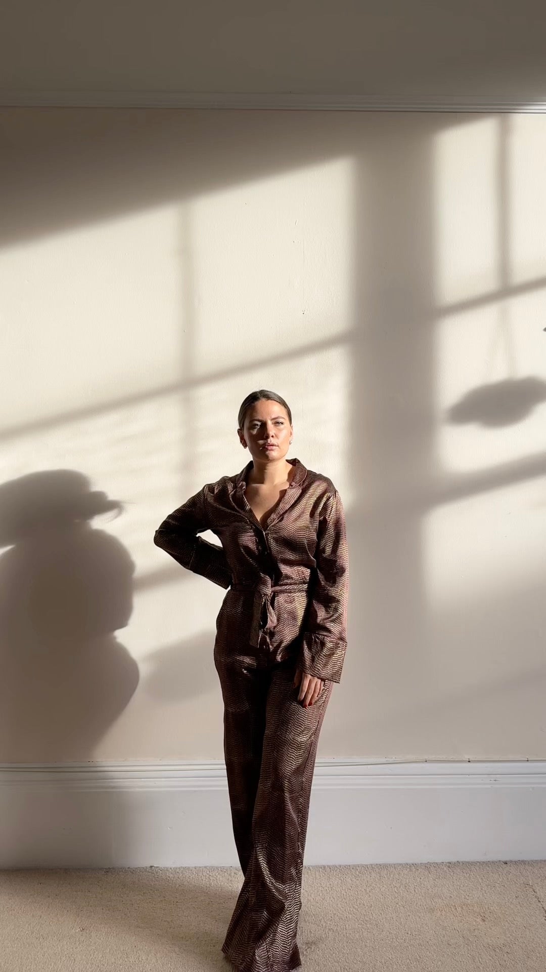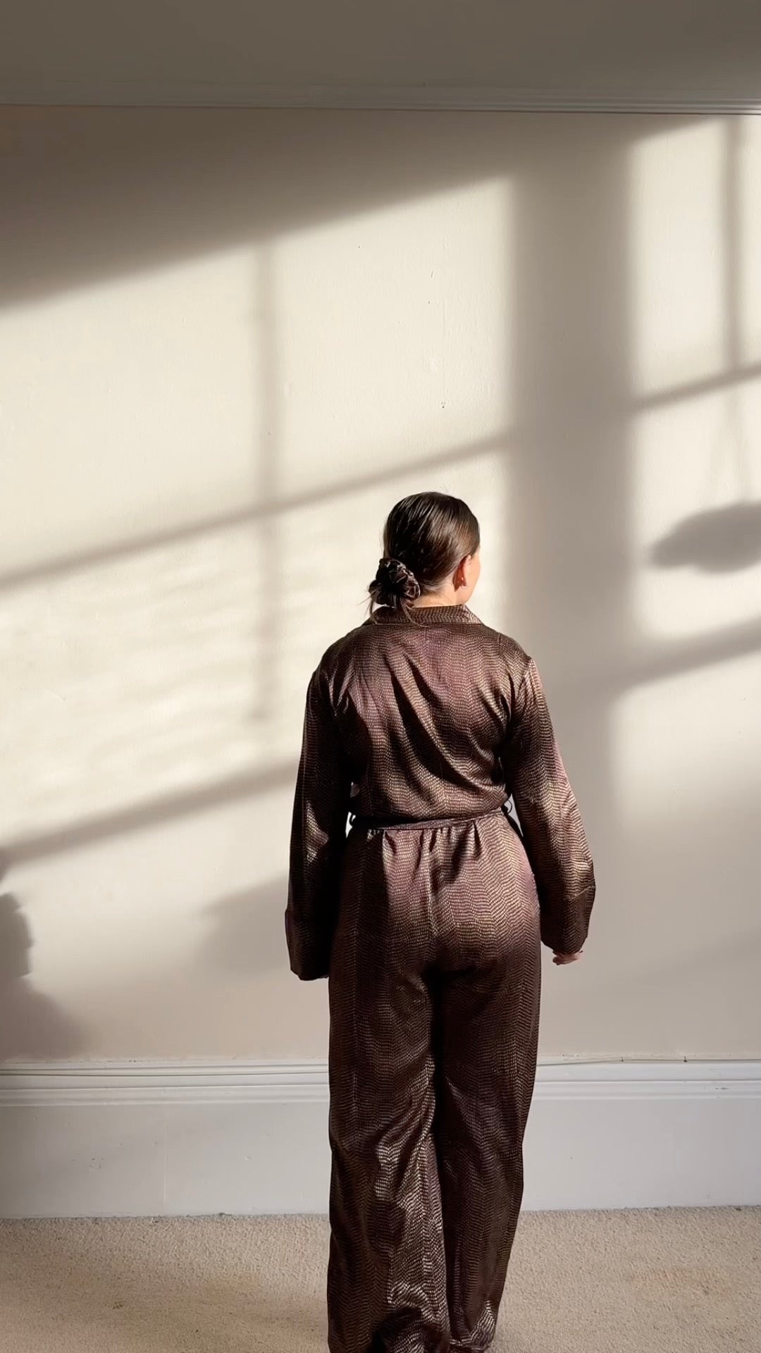 Studio of Clementine’s Chocolate sparkle jumpsuit will make you stand out from the crowd. The garment is dark brown with sparkly golden speckles, perfect for parties all year rOyne. Made from 100% silk this piece is lightweight and comes with a matching tie around the waist so you can style it how you wish.
